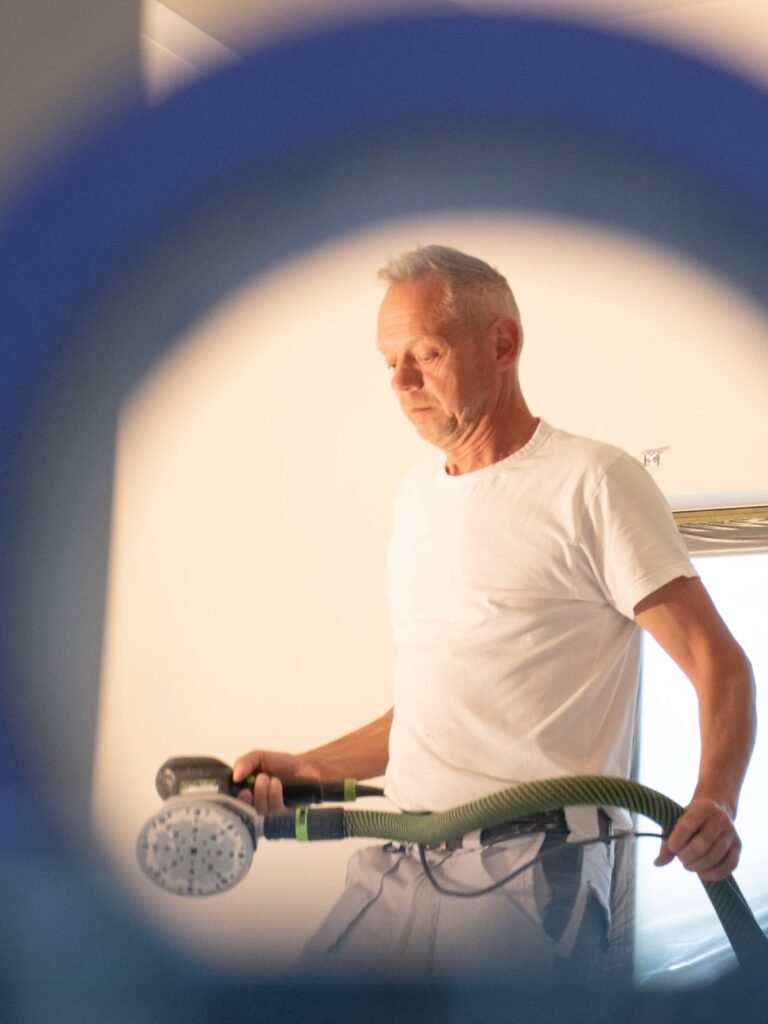 Schilderen is altijd mijn passie en hobby geweest, en ik vind het nog steeds bijzonder dat ik nu de man ben die met zijn verfpot je interieur kan opfleuren. We werken zowel binnen als buiten, maar we zijn bijzonder enthousiast over het detailwerk in het interieur – dat is waar we onze ware ‘Rembrandt’ kunnen loslaten en streven naar perfectie. De kaleiwerken? Dat zijn de kers op de taart en zorgen voor de nodige afwisseling.
